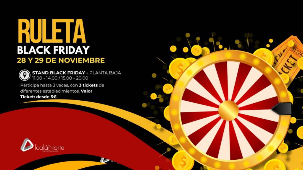 El Black Friday llega con más emoción que nunca a Centro Comercial Alcalá Norte. Este 28 y 29 de noviembre, además de disfrutar de los mejores descuentos, podrás ganar premios al instante participando en nuestra divertida Ruleta Black Friday.